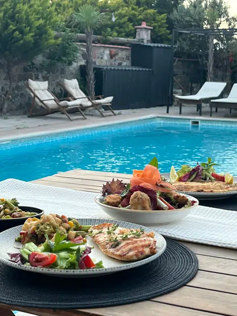 Ege otlarıyla zenginleşen tabaklar, taş fırından çıkan sıcacık ekmekler ve ev yapımı mezeler… Her şey sade ama unutulmaz. Gün batımında bahçede kurulan bu sofralar, tatilin en keyifli anına dönüşür. Burada yemek yemek sadece karın doyurmak değil; doğallığı, sadeliği ve Cunda'nın lezzet mirasını paylaşmaktır.